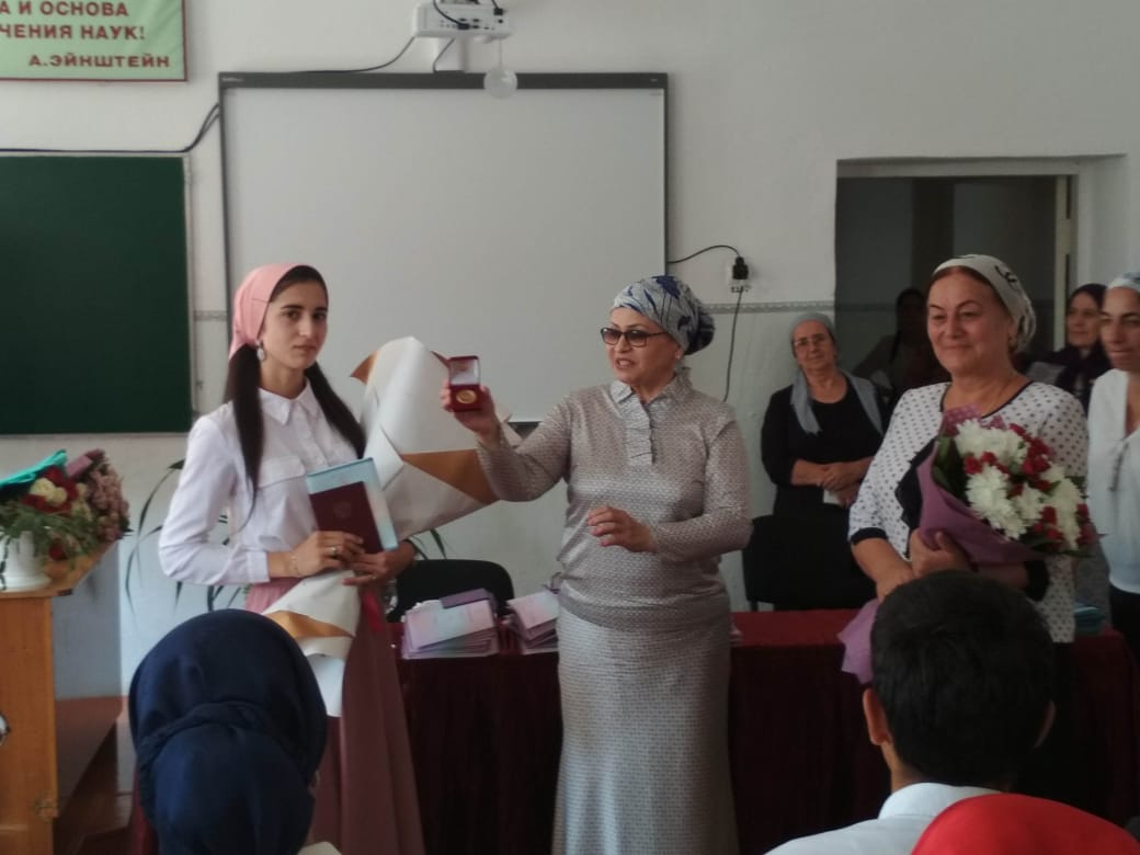 10.07.201910 июля 2019года состоялось торжественное вручение аттестатов выпускникам 2019года. На этом мероприятии присутствовала начальник МУ «Управление образования Гудермесского муниципального района» Куразова Малика Исмаиловна. Она вручила ученице 11 класса Гачалаевой Муъминат, окончившей школу в этом году с отличием, медаль «За особые успехи в учении».