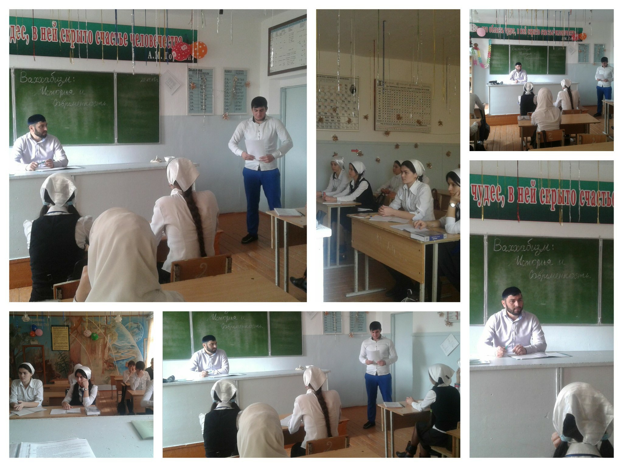22.12.201522 декабря 2015г в МБОУ "Кади-Юртовская СШ им.Р.Ф.Умарова" педагог- организатор по ДНВ и Р Касумов Р.Х. провел среди старшеклассников беседу на тему «Ваххабизм. История и современность». С докладом выступил ученик 11 класса Бустаев М-А. В конце беседы старшеклассники задавали вопросы Руслану Хасановичу и докладчику. Учащиеся вынесли для себя много полезного, получили ответы на интересующие их вопросы.