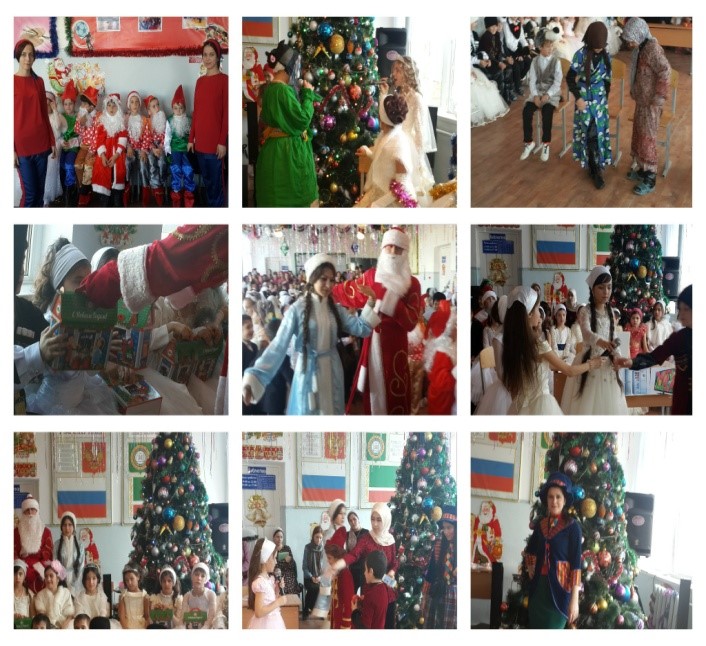 В рамках подготовки новогодних праздников в школе было проведено ряд мероприятий. Был утвержден График проведения новогодних праздников. Проведены беседы с детьми о профилактике детского травматизма, мерах безопасности на водоемах в зимнее время, запрещение использования петард учащимися, организация и проведение Новогодних праздников8.12.15г. установили елку в начальной школе. Украсили зал и классные кабинеты. Также украсили прилегающую территорию и фасады зданий.24-26.12.15г. было оформлено фойе школы, зал в котором установленаелка.Новогодние представления проводились 27, 28 и 29, 30 согласно графику. Было показано новогоднее представление с участием сказочных персонажей:Для 1 - 4 классов представили новогоднюю сказку «Керла шо»Г1ура Дада- Бустаев Магомед 11 Акл.Лайн Аьзний- Сулиманова Элиза 11 А кл.Ц1оьмалгш - Эзерханова Заира 11 А кл и Тезиева Маржан 11А кл.Хьуьнан Зезаг- Тутуева Сацита 11 А кл. Для 5 - 8 классов представили новогоднюю сказку «Вышла зимушка-зима, очень рада детвора…»Дед Мороз- Бустаев Магомед 11 Акл.Снегурочка- Сулиманова Элиза 11 А кл.Ведущие - Эзерханова Заира 11 А кл. и Тутуева Сацита 11 А кл. Учащиеся 9-11 классов провели вечера согласно графику. А так же разыграна Новогодняя лотерея.Классы показали хорошую подготовку к Новогодней елке. Подготовили и показали новогоднее представление. Дети пели песни, водили хороводы, танцевали лезгинку. Учащиеся 1-3 классов получили сладкие подарки от Главы Республики Кадырова Р.А.