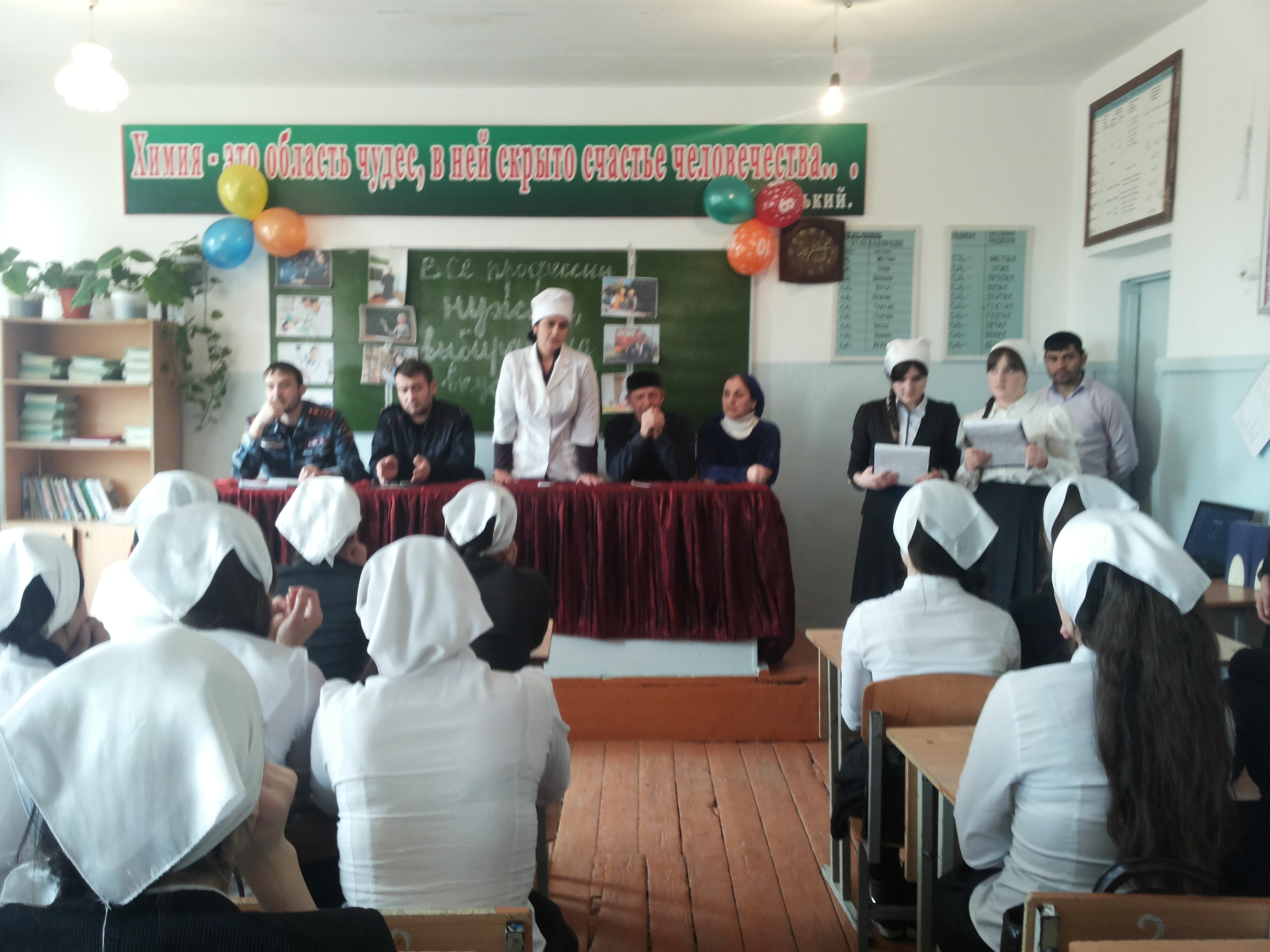 03.02.2016В МБОУ «Кади-Юртовская СШ им.Р.Ф.Умарова» 3 февраля 2016г провели мероприятие «Все работы хороши, выбирай на вкус», для выпускников 9-х и 11 классов по выбору профессии. Были приглашены на встречу с выпускниками представители разных профессий.