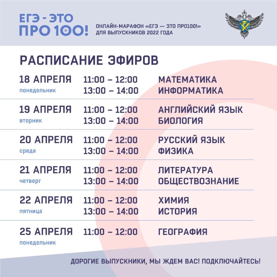 18.04.202218 апреля стартовал онлайн-марафон «ЕГЭ — это про100!» для выпускников 2022 года. Трансляции проходят в официальных аккаунтах Рособрнадзора: ВКонтакте https://vk.com/rosobrnadzor Rutube https://rutube.ru/channel/25110944/
