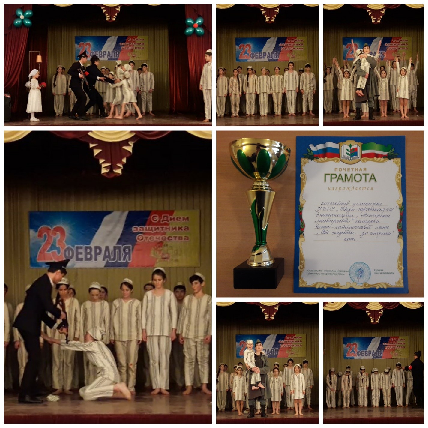 Коллектив учащихся МБОУ «Кади- Юртовская СШ им.Р.Ф.Умарова» инсценировали песню «Бухенвальдский набат» и стали победителями в номинации «Актерское мастерство» конкурса военно-патриотической песни «От солдата до генерала». Коллектив учащихся бал награжден Кубком и Почетной грамотой.