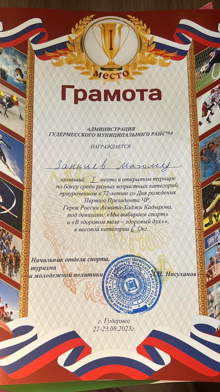 22.08.2023Ученик 9 класса МБОУ «Кади-Юртовская СШ им.Р.Ф.Умарова», Занкиев Магомед занял 1 место в открытом турнире по боксу среди разных возрастных категорий, приуроченном к 72 летию со Дня рождения Первого Президента ЧР, Героя России Ахмата-Хаджи Кадырова, под девизами: «Мы выбираем спорт» и «В здоровом теле-здоровый дух». Это не первая победа Магомеда в подобных соревнованиях. Дала т1аьхье беркате йойла!