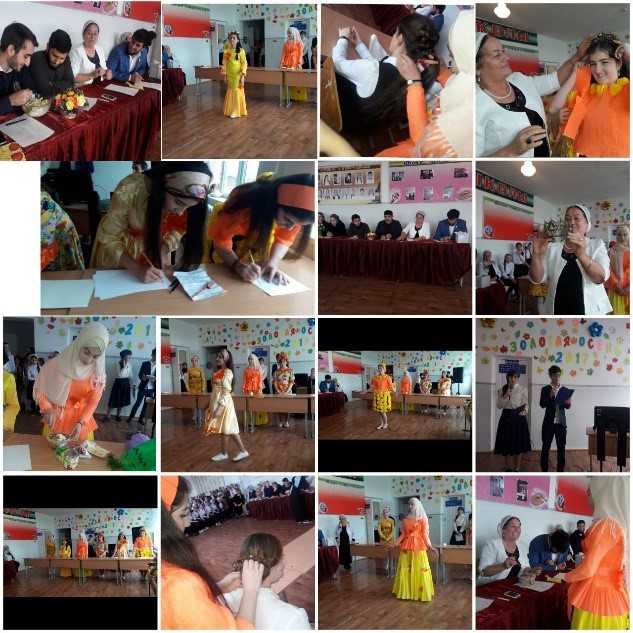 Самопредставление. Конкурсанты рассказывали о себе, о своих увлечениях. «Модный приговор»- участницы представляли свой костюм, его название. «Осенняя фантазия» - участницы на бумаге показывали красоту осени, выражая свои чувства к этому удивительному времени года . «Поэтическая тетрадь» - участницы читали стихотворения про осень5. «Кулинарный поединок»- конкурсантки готовили осенний салат. Конкурс «Задания по карточкам». Участница выходит на сцену и вынимает из мешочка одну карточку, на которой написано задание, которое надо выполнить. «Наши таланты» - участники показали как они умеют танцевать. «Осенние дары»- каждый конкурсант провел презентацию своей корзины. После окончания конкурсной программы члены жюри огласили результаты: 3 место- Элимхаджиева Хава(9А кл.)