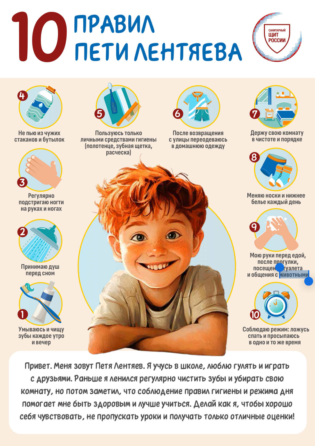 16.10.2024Творческая работа одного из победителей Всероссийского конкурса детских рисунков «Персонаж здорового образа жизни» 2023 года, где был изображен Петя Лентяйкин, вдохновила команду Роспотребнадзора создать познавательные и яркие визуальные материалы для детей.Так появился Петя Лентяев - веселый школьник, задорный мальчишка, который раньше ленился, но потом понял, что соблюдение простых правил гигиены, правильное питание и здоровый образ жизни помогают лучше себя чувствовать и хорошо учиться.Теперь Петя в доступной и простой форме рассказывает другим детям про важные правила заботы о здоровье.