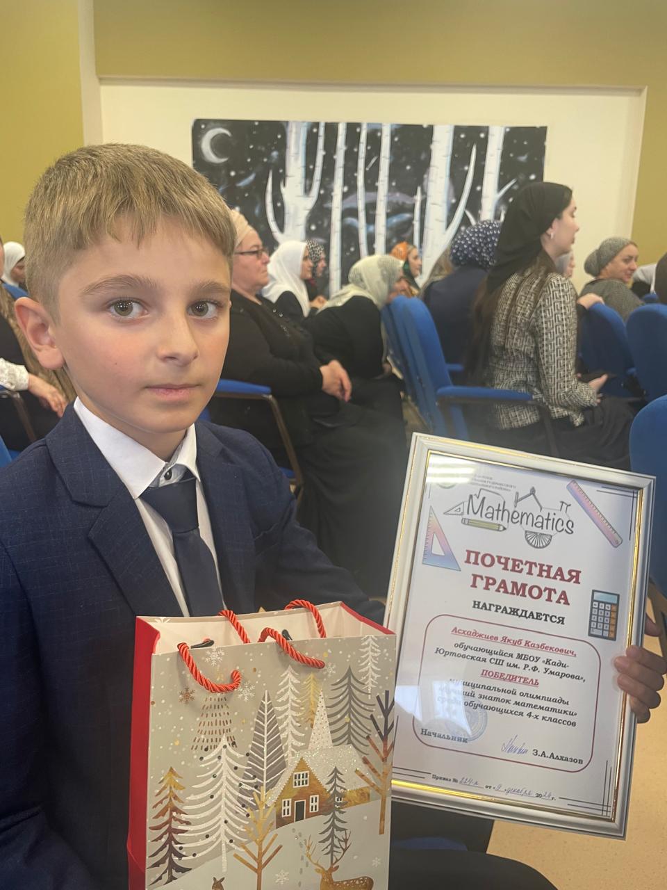11.12.2024Ученик 4В класса МБОУ «Кади-Юртовская СШ им.Р.Ф.Умарова» Асхажиев Якуб стал победителем муниципального этапа олимпиады по математике «Лучший знаток математики». Он награжден почетной грамотой МУ «Управление образования Гудермесского муниципального района». Якуб, поздравляем с твоей первой победой в олимпиаде! Пусть это будет не последняя твоя победа. Только смелый, уверенный, знающий человек мог победить. Молодец! Желаем с таким же упорством и энтузиазмом продолжать поглощать знания. Желаем успехов, саморазвития, интересных открытий и важных событий в жизни!